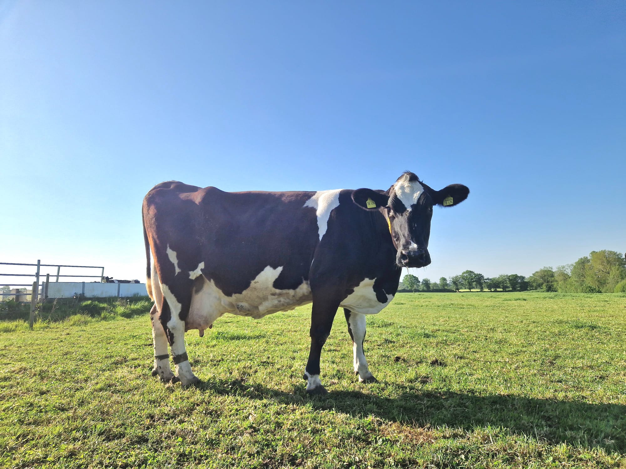Auf dem Hof Backensholz haben die Mitarbeitenden ihre speziellen Lieblingstiere. Rind 2155, genannt “Zucker”, ist zum Beispiel sehr verschmust, während “Tonne” aufgrund ihrer Spitzenleistungen bei der Milchproduktion bekannt ist. Die älteste Kuh im Stall ist die Nummer 68, genannt “Oberlicht”. Sie ist bereits 12,5 Jahre alt und aktuell mit dem 11. Kalb tragend. Als Trockensteherin genießt sie gerade ihren Urlaub kurz vor der Geburt. Das unten stehende Foto einer Schwarz-Bunten zeigt Oberlicht auf der Weide. Das hohe Alter von Milchkühen kann Aufschluss über die vorherrschenden Haltungsbedingungen geben. Denn nur gesunde, optimal versorgte Kühe geben Milch und erreichen gleichzeitig ein hohes Alter.