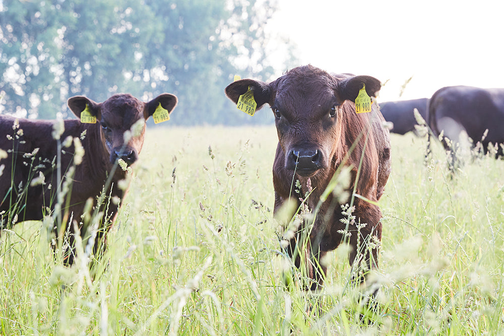 Auf Gut Kerkow ist die schottische Rinderrasse Black Angus beheimatet. Das hochwertige Fleisch der Tiere zeichnet sich durch eine intensive und gleichmäßige Marmorierung bei gleichzeitigem Vorhandensein eines kräftigen Rindfleischaromas aus. Nicht umsonst findet die Rasse inzwischen weltweite Verbreitung und ist aus den Regalen des Premium Fleischsortiments nicht mehr wegzudenken. Die kleinrahmigen Fleischrinder zeichnen sich durch ihre Gutmütigkeit sowie Robustheit aus, sodass sie optimal für die ganzjährige Weidehaltung geeignet sind. Die 180 Mutterkühe leben gemeinsam mit ihren Kälbern aufgeteilt auf zwei Herden das ganze Jahr über auf den weitläufigen Weiden von Gut Kerkow.