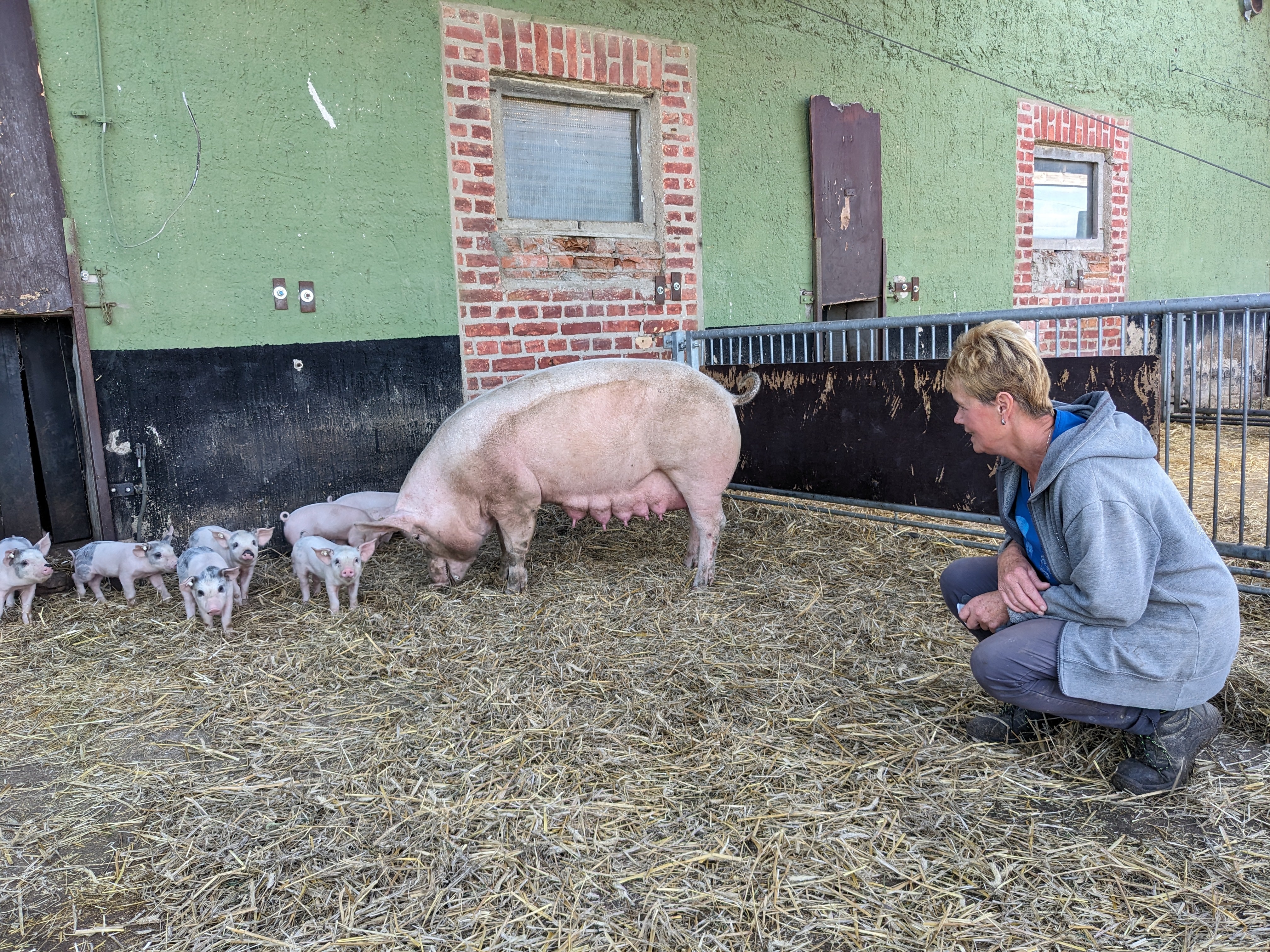 Die Muttersauen leben in 4er Gruppen zusammen in einem Stall mit Stroh und Auslauf an der frischen Luft. Nur für die Geburt ihrer Ferkel werden die von der Gruppe getrennt, damit sich Sau und Ferkel zunächst für einige Tage aneinander gewöhnen können. Danach geht's zurück in die Sauengruppe. Mit durchschnittlich 12 Ferkeln pro Wurf kann da ein ganz schöner Wuselhaufen zustande kommen. Im Alter von etwa 6 Wochen werden die Ferkel abgesetzt, die Meute in zwei Gruppen á 20 bis 25 Tiere aufgeteilt und in jeweils ein eigenes Abteil im Maststall aufgestallt. Hier werden die Jungtiere mit gesundem Bio-Futter von einer Futtermühle versorgt, die das Getreide u.a. vom Gut Temmen bezieht. Hinzu kommt Stroh, das teilweise als Einstreu genutzt wird und gleichzeitig als Beschäftigungsmaterial genutzt wird. Auch eingehängte Ketten oder Kanister und Bälle dienen als Spielzeug, um die ausgeprägte Neugier der Tiere zu befriedigen.