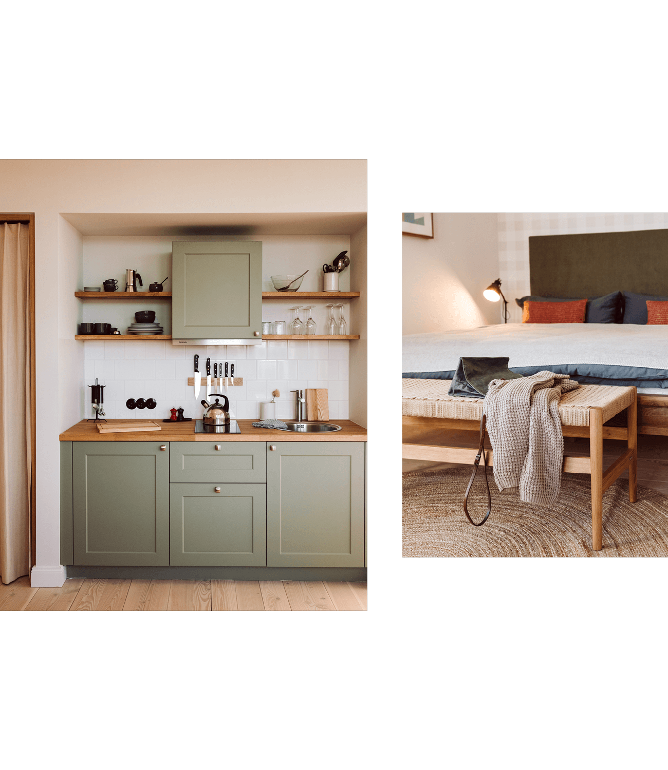 „Klein, aber oho!“ werdet ihr denken. Auch die Ausstattung mit Doppelbett, Duschbad mit WC, Kitchenette mit zwei Kochplatten und Geschirrspüler sowie Esstisch lässt Herzen höher schlagen.