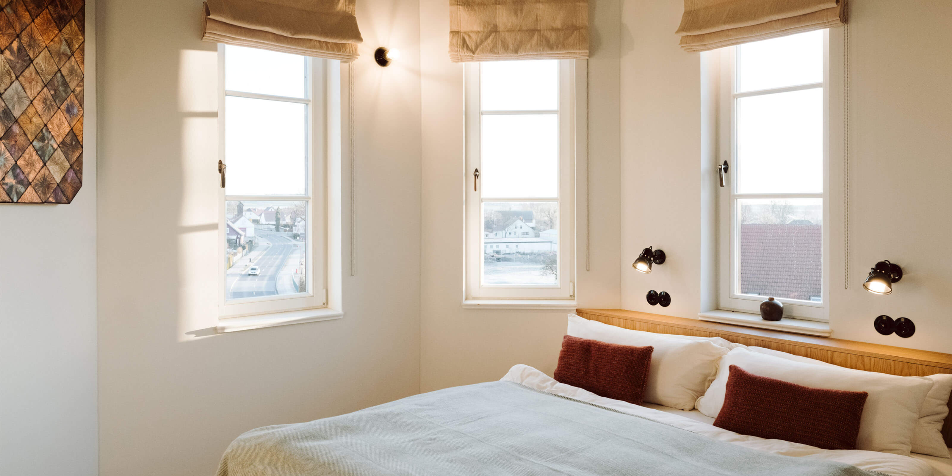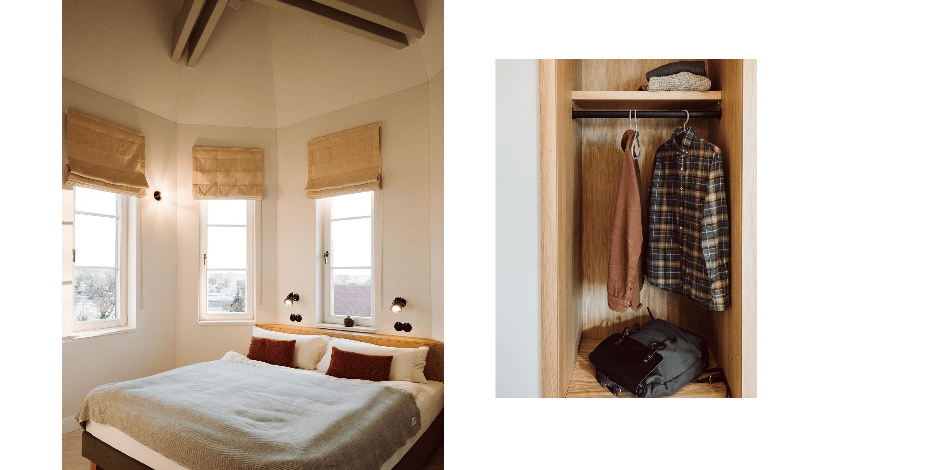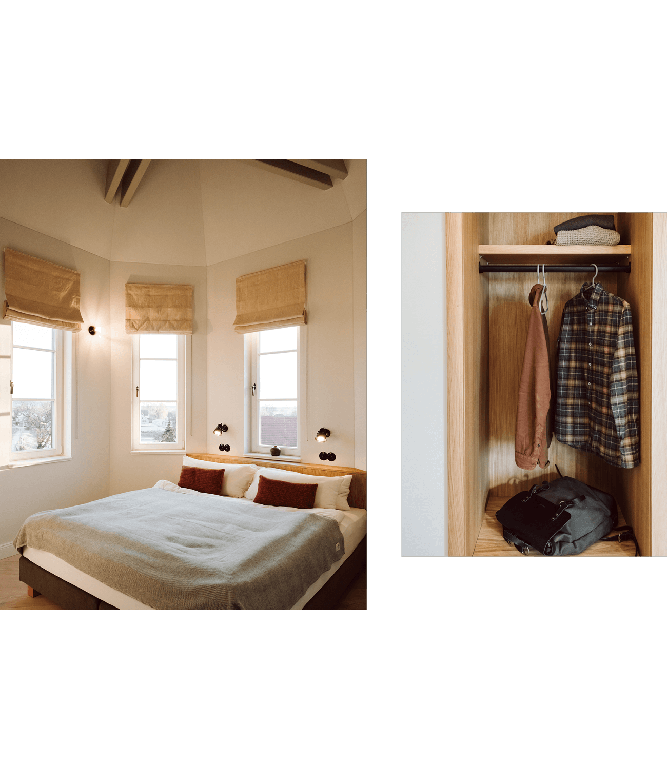 Die Liebe zum Detail ist spürbar: im historischen Turm, befindet sich ein romantisches Schlafzimmer mit Doppelbett. In dem sechseckigen Raum habt ihr einen Rundblick auf Dorf, Kirche und Hofgeschehen.