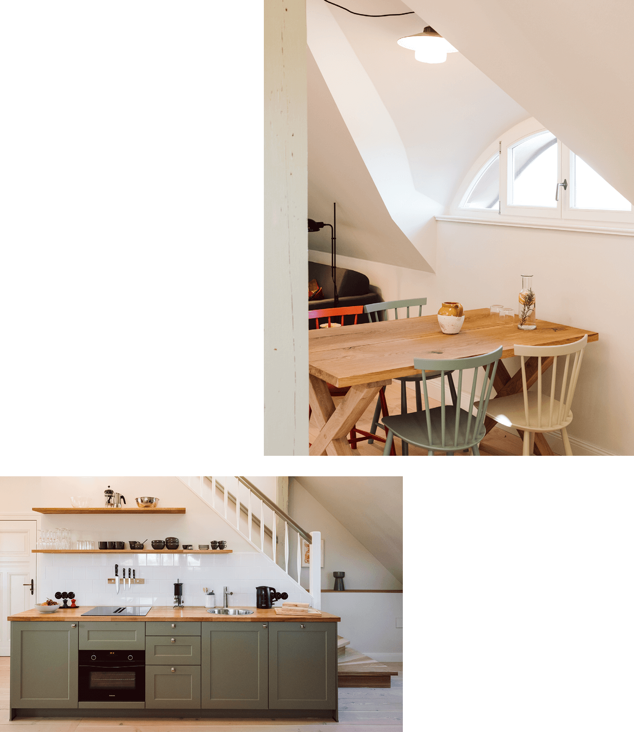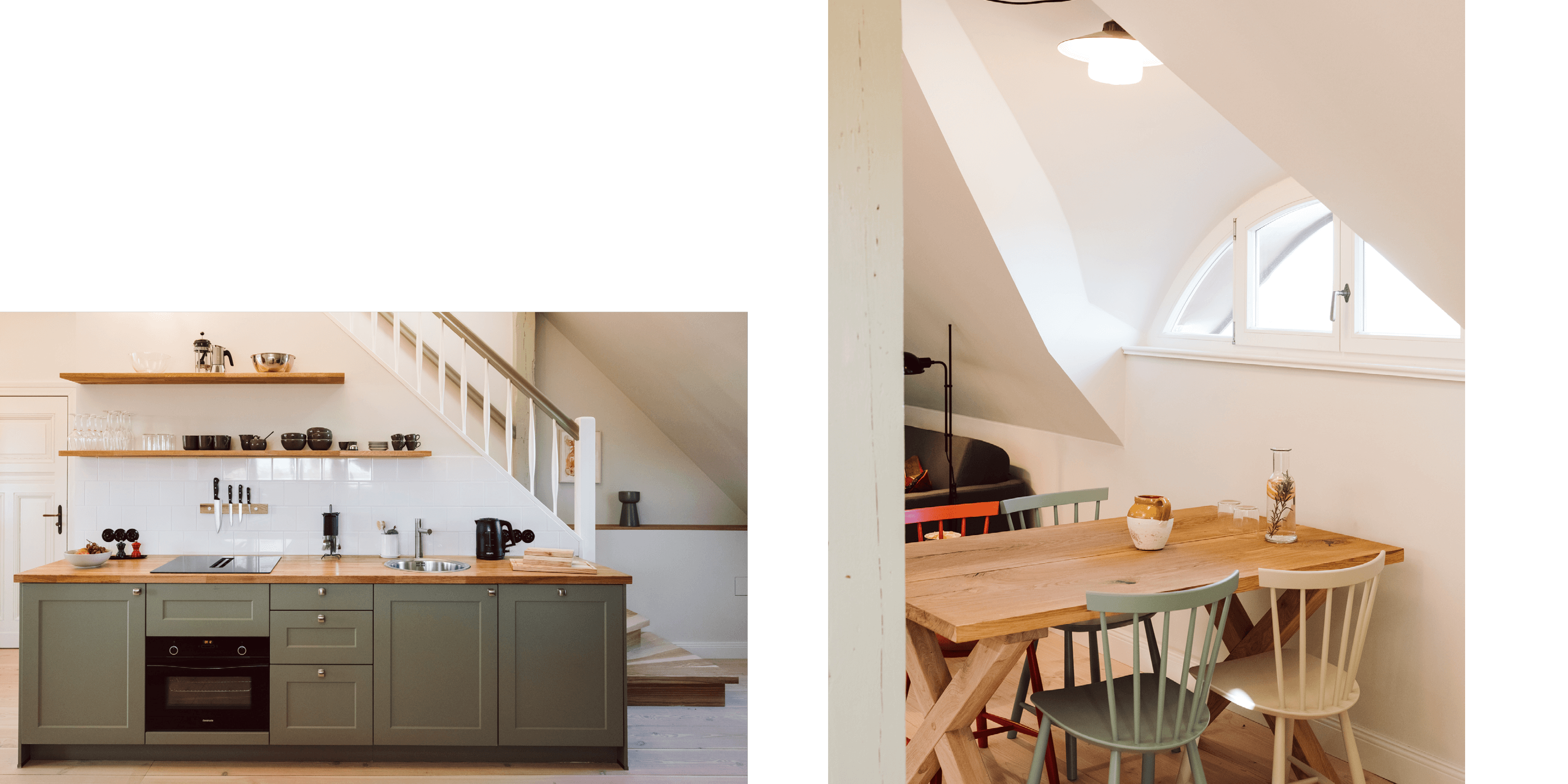 Das Zentrum der Wohnung bildet die Küche mit gemütlichem Esstisch. Von dort aus erreicht ihr über eine Treppe die Empore mit weiterer Schlafmöglichkeit.
