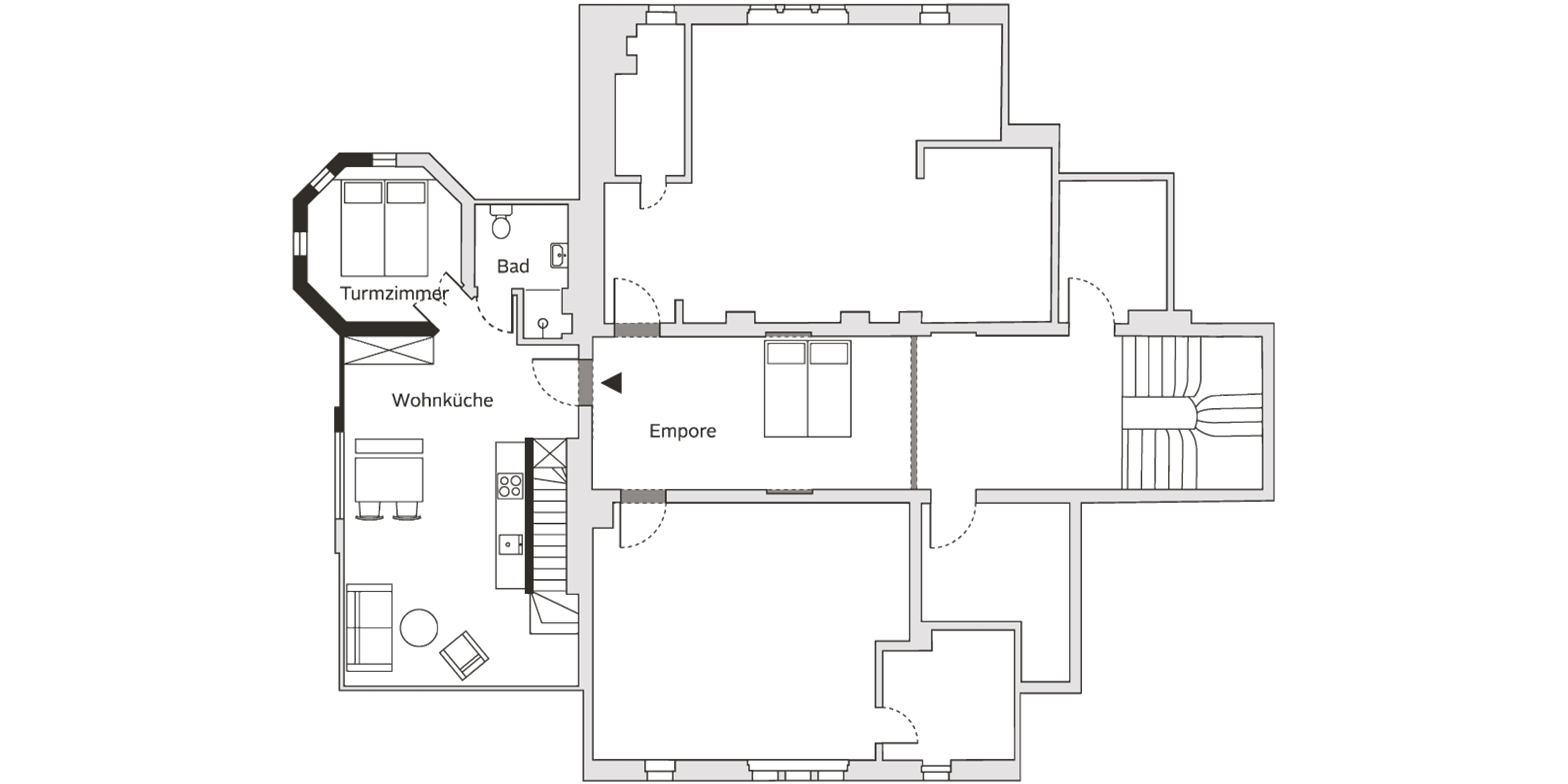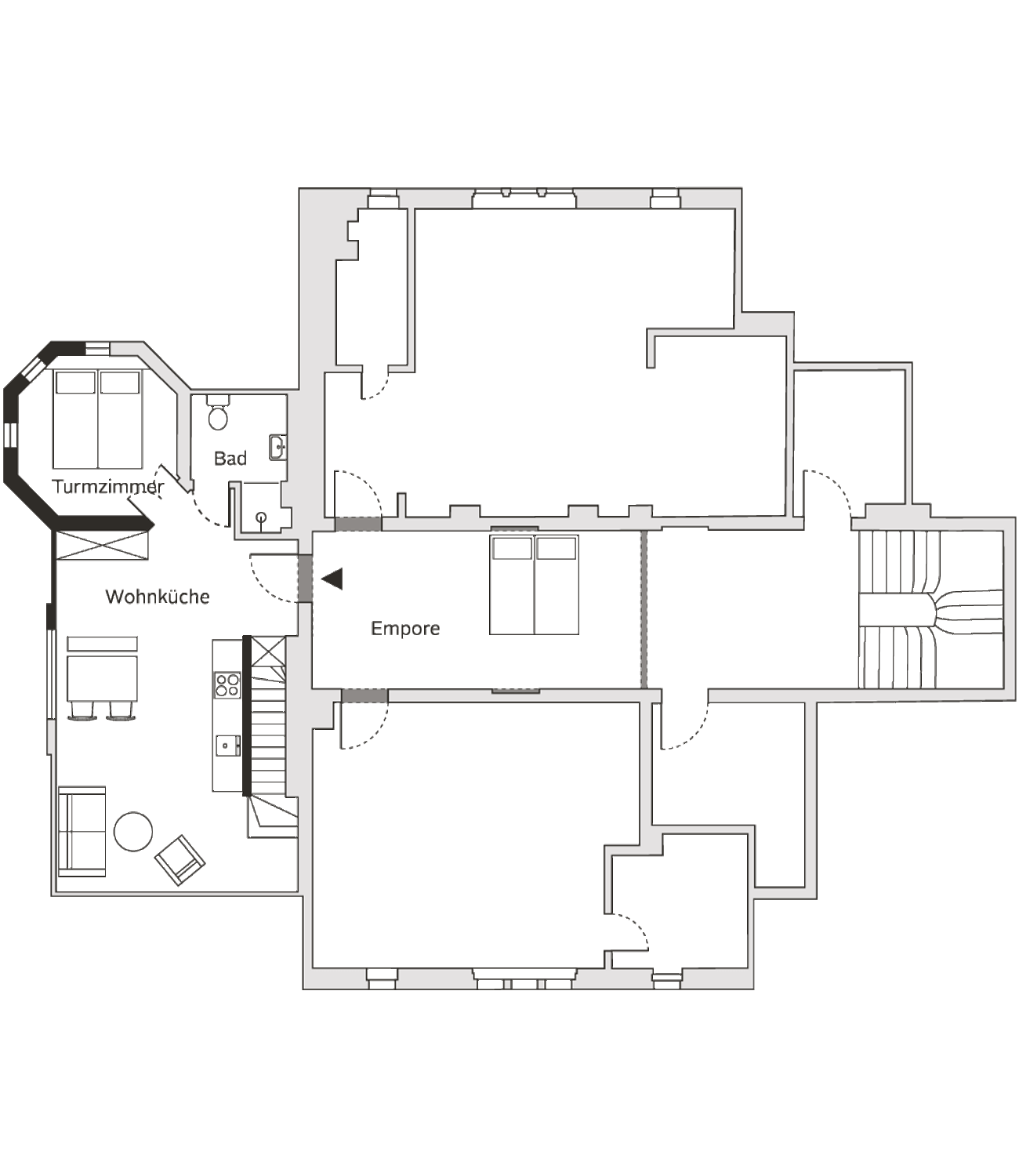 Hier wohnt man nicht, hier residiert man. Ein Schlafzimmer befindet sich im Turm, ein weiteres auf einer Empore im Spitzbogen.