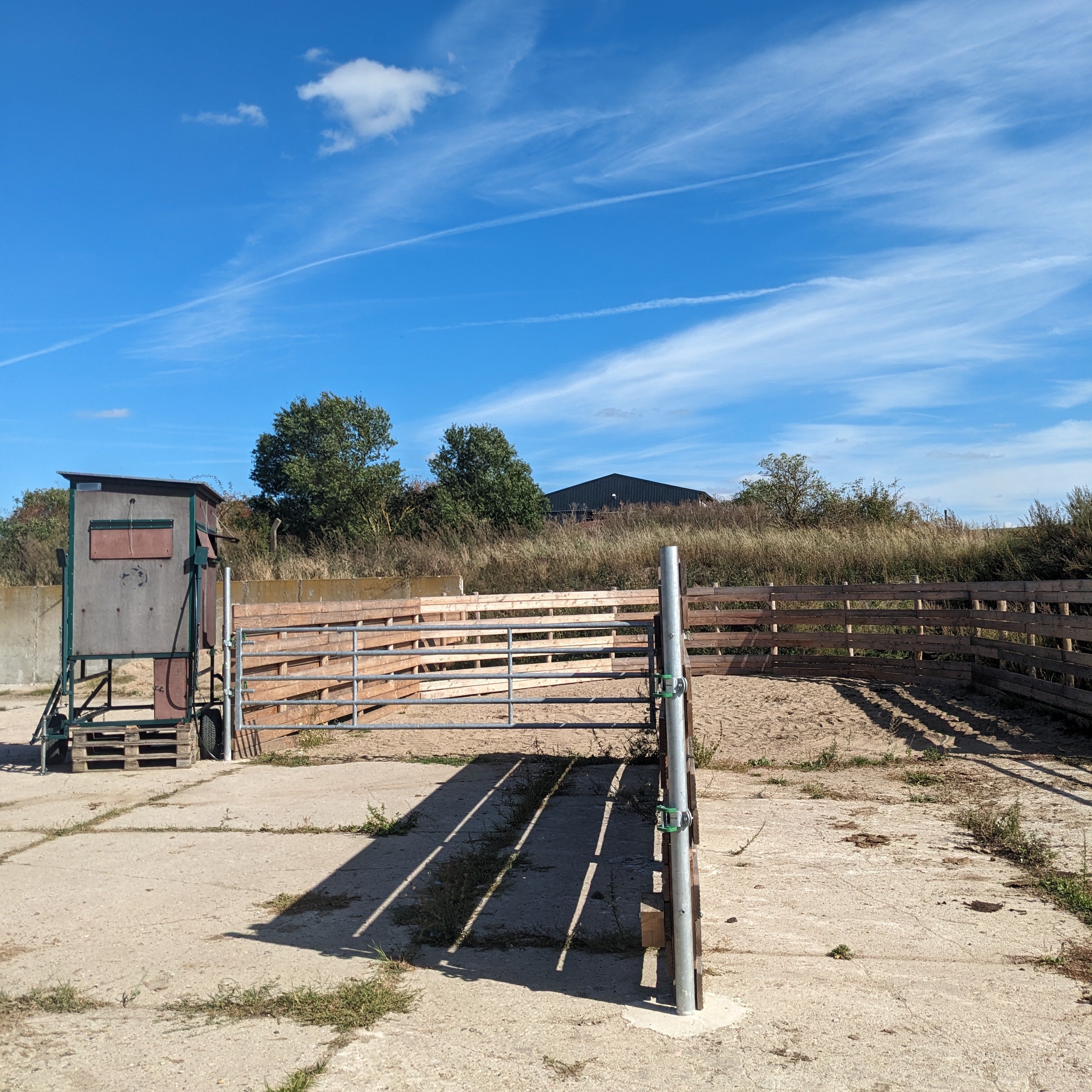 Der Weideschuss berührt ein sehr sensibles Thema, nämlich die Schlachtung eines Tieres zum Zwecke der Lebensmittelproduktion, bei der höchste Maßstäbe an Tierwohl und Fleischqualität angesetzt werden. Untrennbar damit verknüpft ist der optimale Ablauf eines solchen Verfahrens. Dies kann am besten unter standardisierten Bedingungen gewährleistet werden. Aus einer feststehenden Kanzel, im eingeübten Winkel, aus gewohnter Entfernung. Hinzu kommen die Anforderungen an einen hygienischen Ablauf. Direkt neben dem Rondell befindet sich eine befestigte Bodenplatte auf der das erlegte Rind mit Hilfe von Traktoren über einer Plane sauber ausgeblutet und anschließend auf einen speziell dafür angefertigten Anhänger geladen werden kann.
